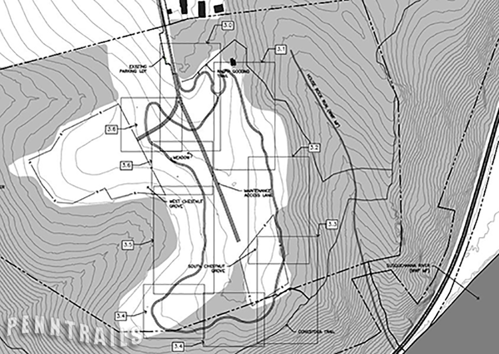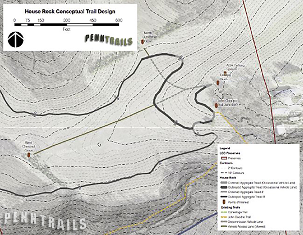 Penn Trails was selected by the Lancaster County Conservancy to complete a conceptual design and subsequent detailed design plan set for House Rock, a preserve owned by the Conservancy that had previously been open to the public but lacked infrastructure to allow for hiking (aside from an existing connector to the regional Conestoga Trail).