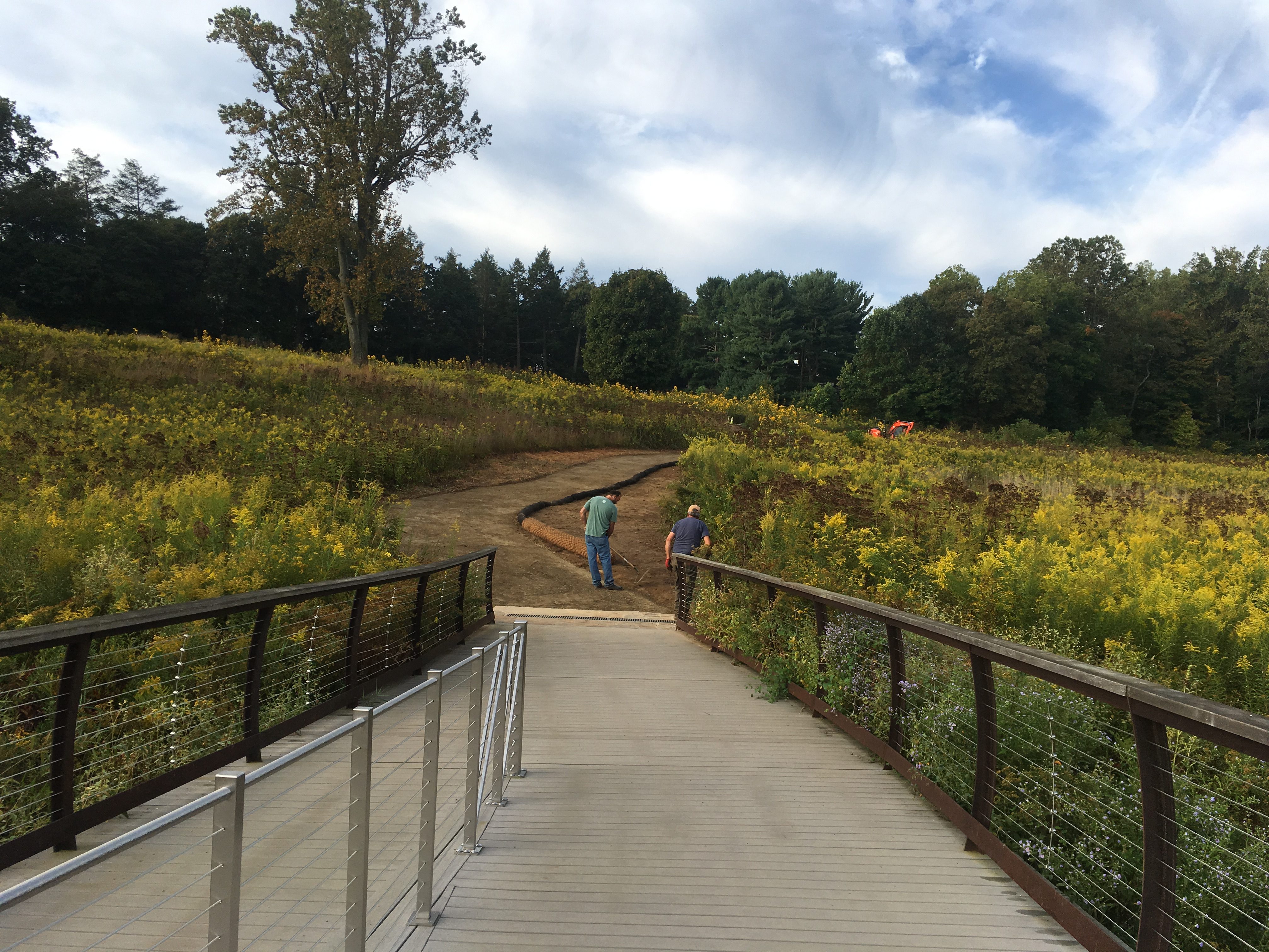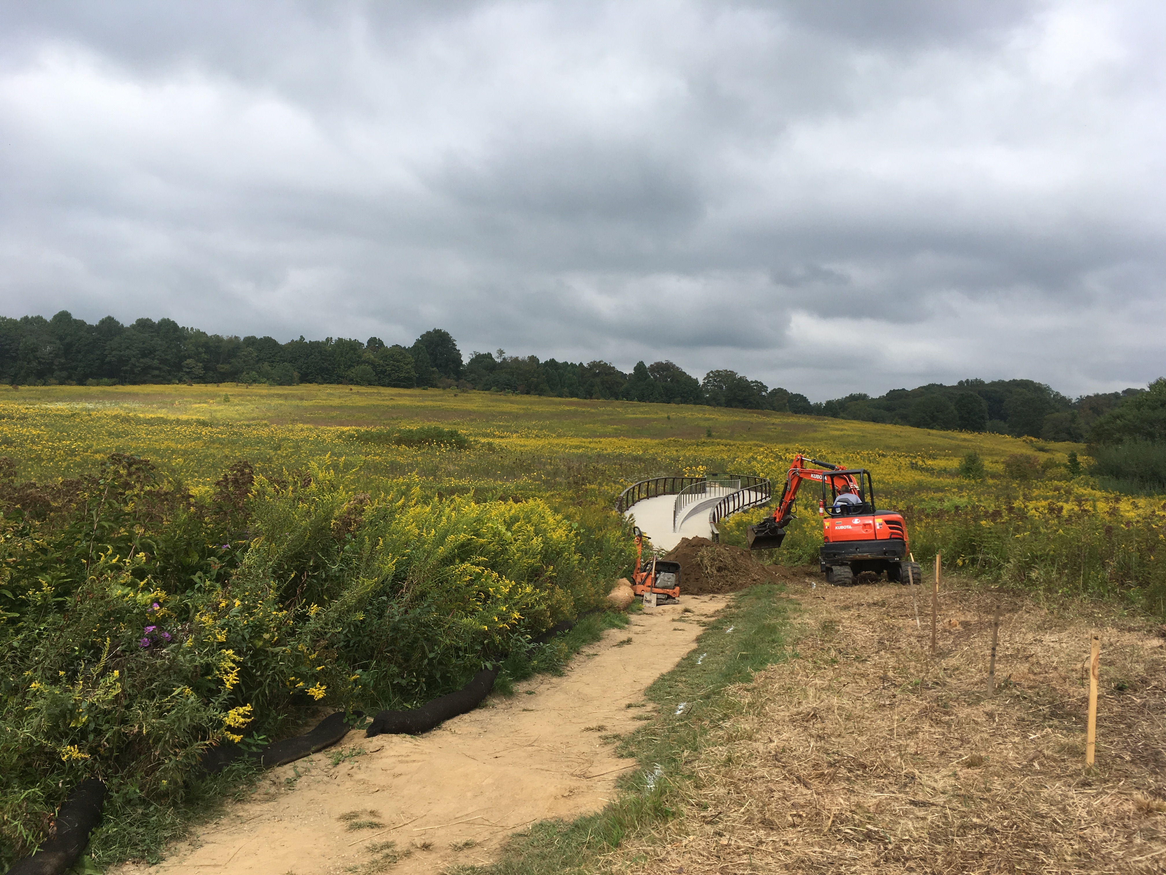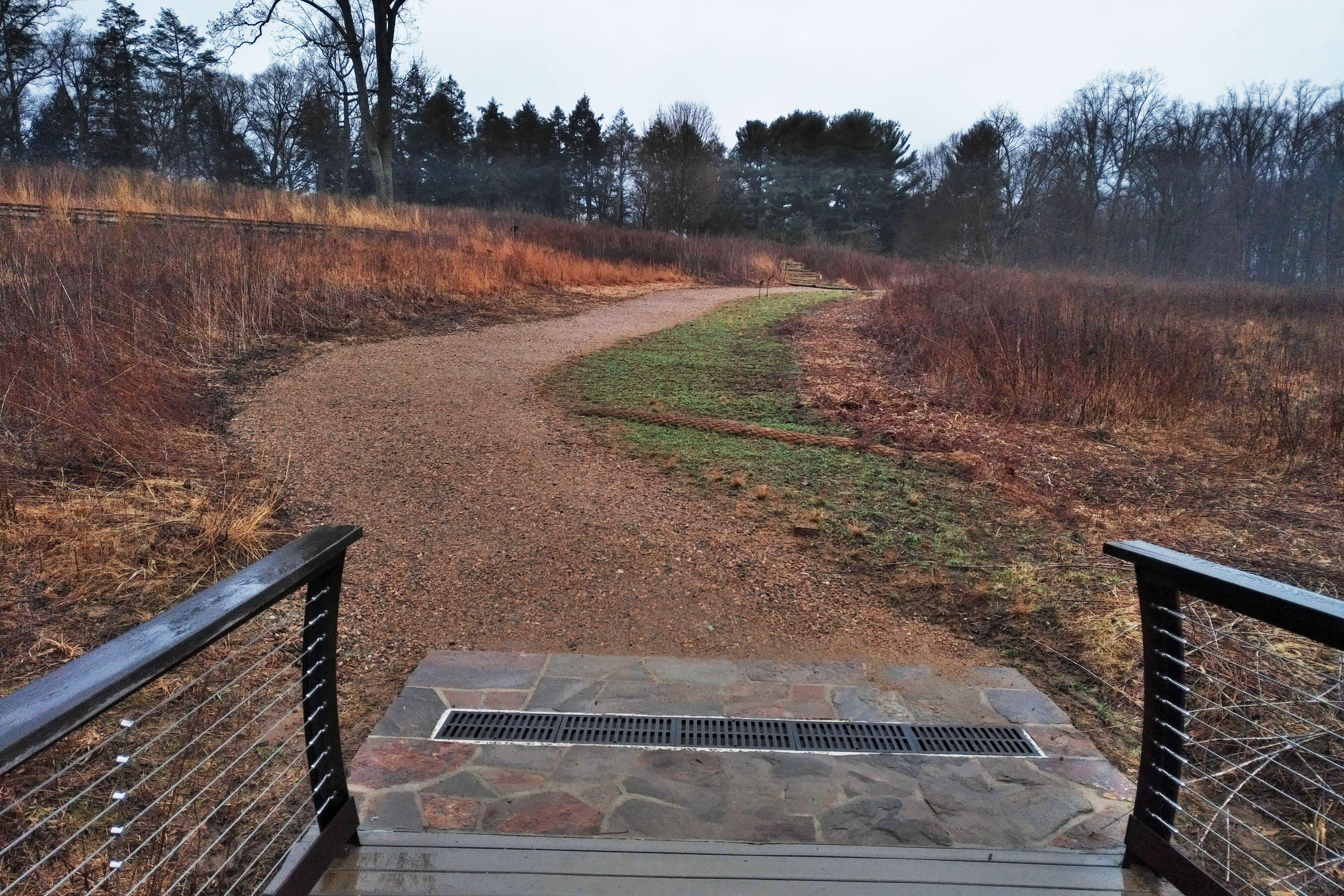 The meadow garden at Longwood Gardens was designed and built by others with an aggregate trail system and pavilion sited at the bottom of a large bowl-shaped meadow slope. Penn Trails was hired to rehabilitate the trail system when stormwater overwhelmed the design, causing the aggregate to sheer away and inundating the pavilion area and downslope trails with water and mud. Early stages of the project were a design-build that involved realignment of the trail and reconstruction to raise the trail above the soggy ground. Currently in progress, later stages of the project involve detailed hydrologic and hydraulic analysis, design of a stormwater conveyance system to protect the new trails, and construction of a flagstone patio with rain garden features around the pavilion area. When complete, the meadow garden will contain a network of universal access aggregate trails that will allow a four-season experience even in the wettest parts of the meadow garden, with a pavilion program area that will be environmentally sustainable despite heavy rainfall.